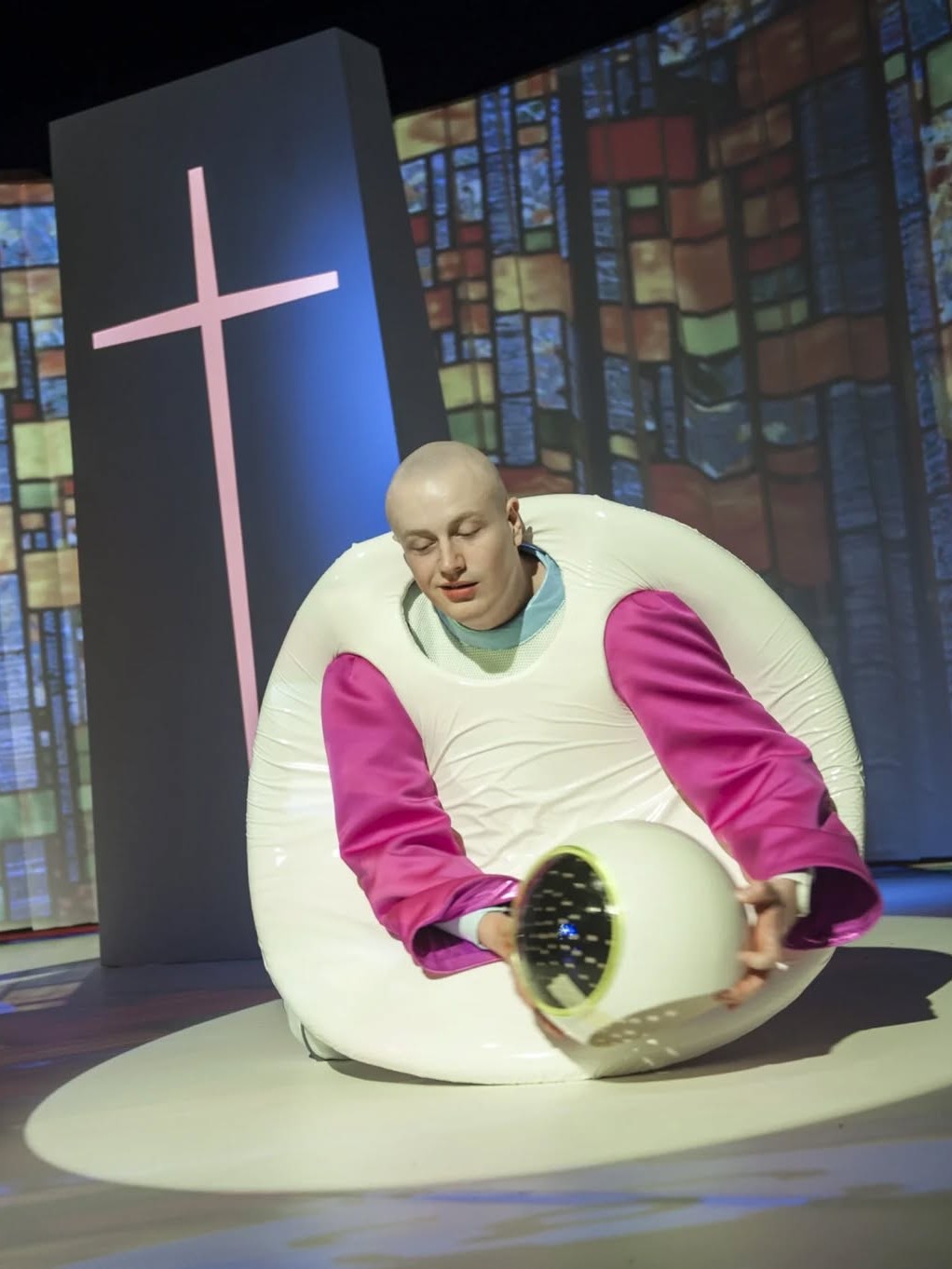 W spektaklu pojawia się światło stroboskopowe i projekcje.