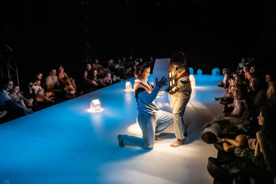 „Here We Live” is a poetic performance about being together, sharing space, and building relationships. Through movement, dance, and interactions with simple objects, a shifting world of home is created—a place that forms, falls apart, and reshapes itself. The performance invites reflection on community, attentiveness, and shared responsibility, presenting theatre as a space for encounter and dialogue.